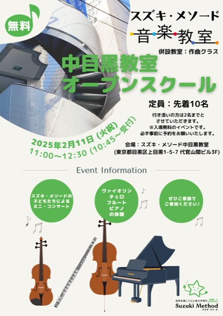 | 会場 | 東京都目黒区 スズキメソード 中目黒教室 (東京都目黒区上目黒1-5-7 代官山関ビル3F) |